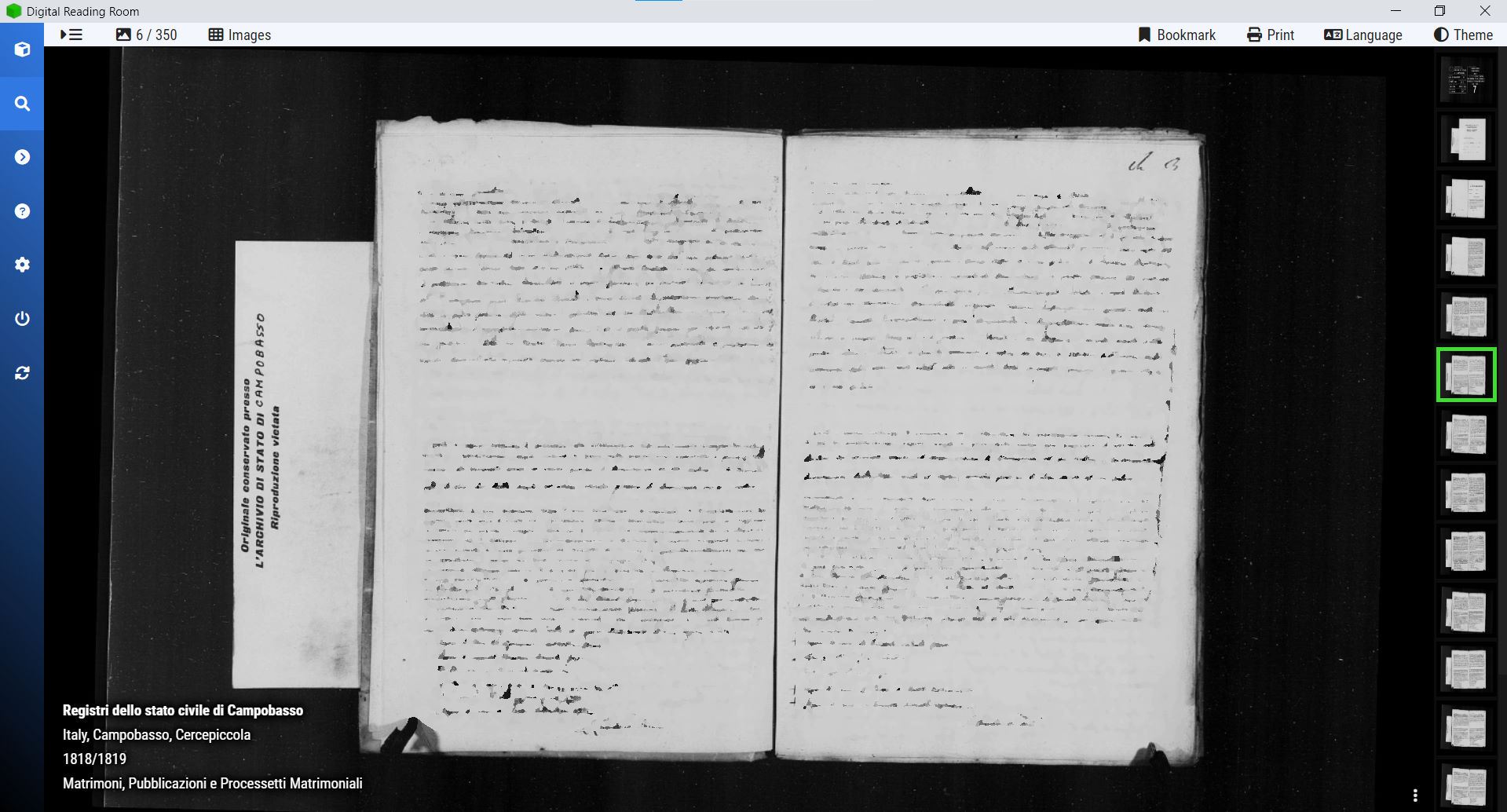 The sidebar on the left shows the different libraries with the number of collections within. Once you click the name of the library, it expands to show the list of collections with basic information such as title, location, year range and life events. Click on a collection to open it, and the images will display in the viewer and the thumbnails strip on at the center and right of the screen, as seen on the picture above.